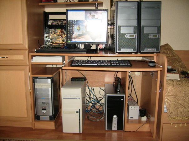 Esta foto mostra a primeira infraestrutura doméstica, o primeiro router e o primeiro sistema de facturação para tráfego e contas de clientes. O quarto estava insuportavelmente barulhento e quente. Decidimos mover toda a infraestrutura doméstica para um armário na casa.